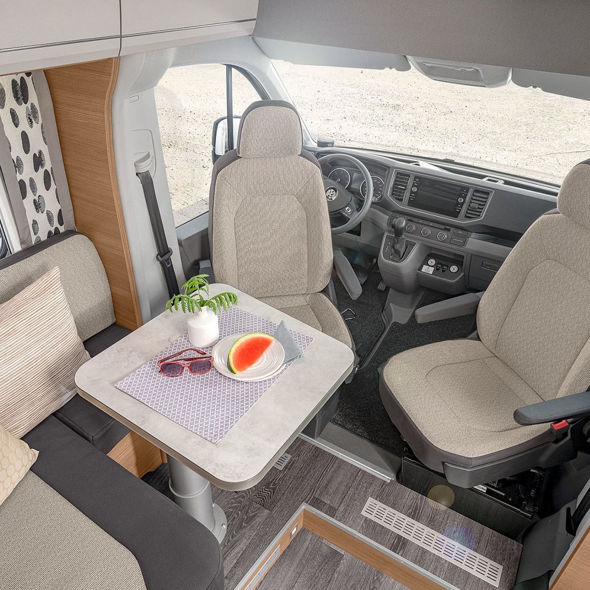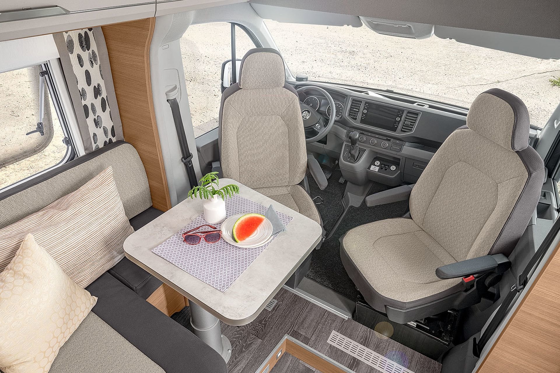 Hochwertige Passform-Sitzbezüge für Fahrerhaussitze im KNAUS Wohnwelt-Design |